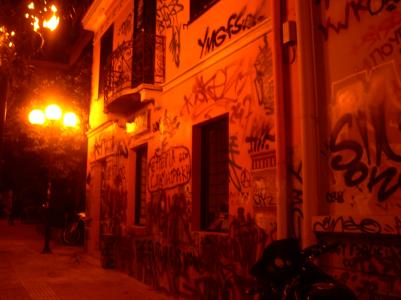 Und danach bin ich mit Clementine noch los um mich mit einigen Deutschen und anderen Erasmus-Studenten zu treffen… na das war ja mal verrückt, erstmal mussten wir mit der Metro nach Omonia, diese Station ist berüchtigt dafür, dass es dort nicht so sicher ist, wir haben uns also nicht dort aufgehalten und sind auf die Suche nach den anderen gegangen. Wir wollten uns im alternativen Studentenviertel Exarchia treffen… uuund dann haben wir erstmal die ersten brennenden Mülltonnen vorgefunden, also wirklich wie im Fernsehen… naja aber die Studenten schien das alles wenig zu interessieren, ich glaub man ist dort schon an den Anblick gewöhnt, wir haben uns dann aber nicht getraut die brennenden oder qualmenden Tonnen zu fotografieren, also denkt euch das hier dazu: