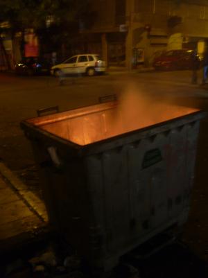 Die Mülltonnen brennen auch wieder. Diesmal aber nur eine vereinzelte in Exarcheia.